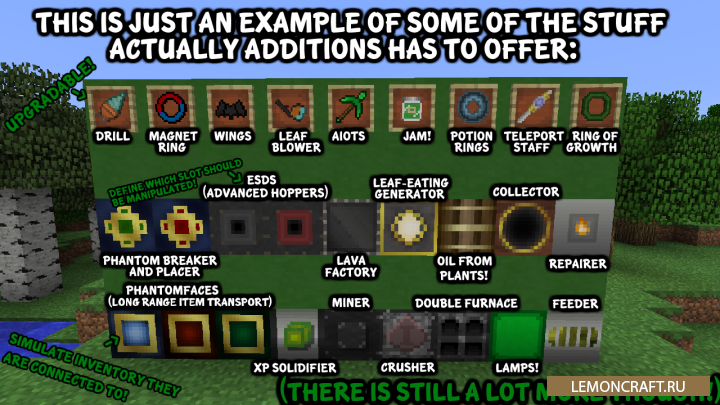 Индустриальный мод Actually Additions добавляет в игру много новых блоков, механизмов, оружия и брони. Кроме этого, после установки мода, вы сможете найти новые виды растений, новые руды, лазеры, автоматизированные фермы и много других полезных штук. Мод имеет встроенную инструкцию по изучению всех особенностей мода. Мод достаточно обширный, так что готовьтесь затратить немного больше времени на его освоение.